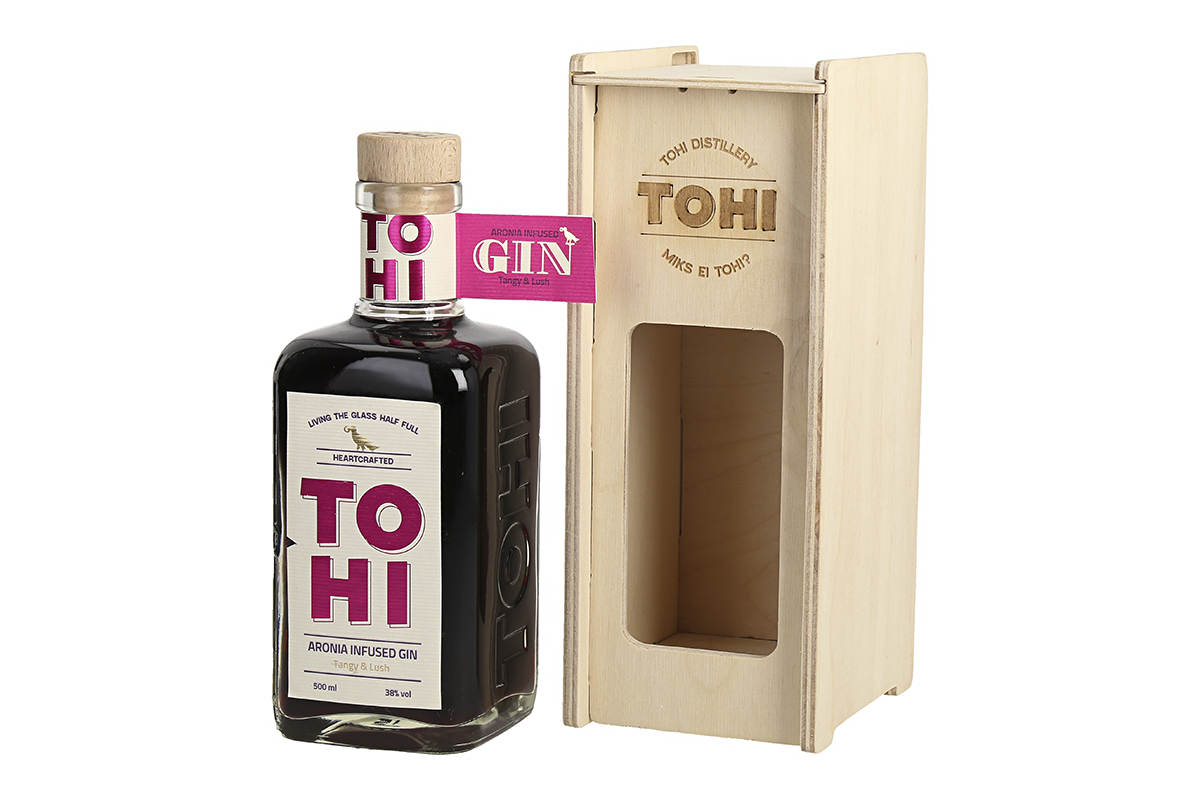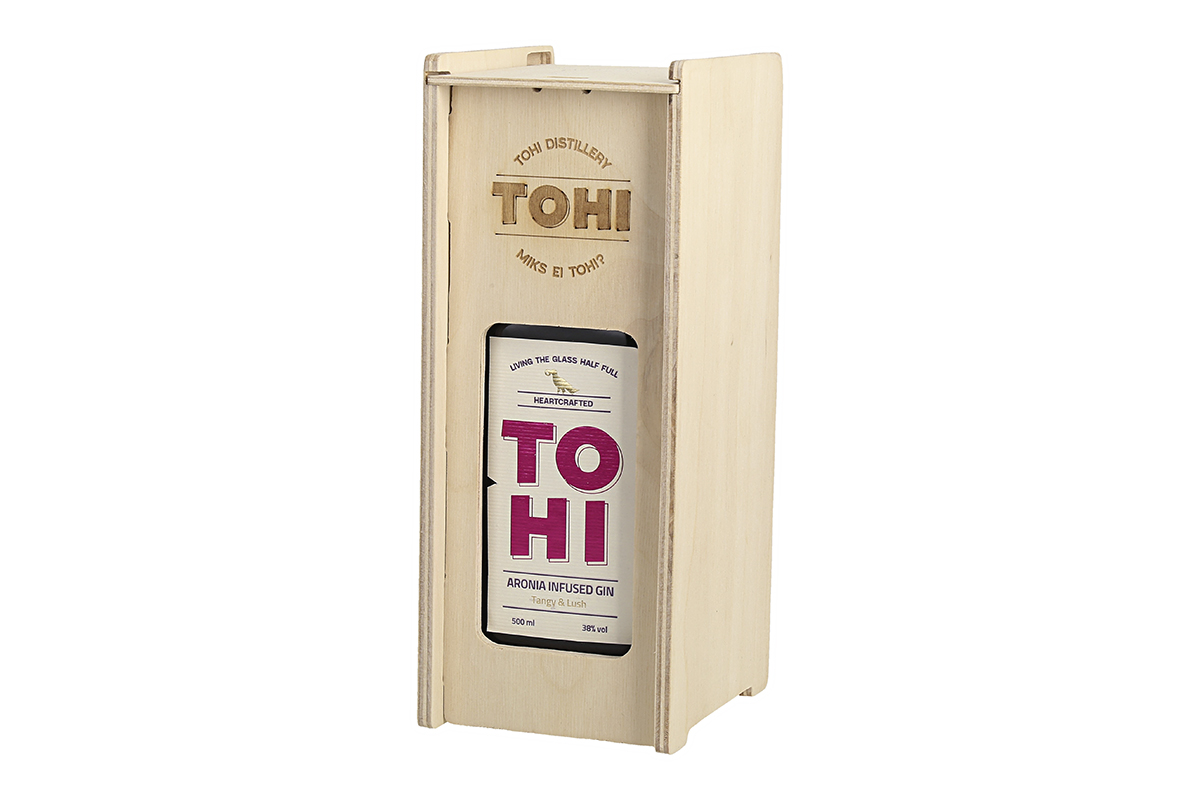 Pudel TOHI Aronia Infused Gin ´i pakendatult viisakasse vineerkarpi. Hea idee firmakingituseks või džinnisõbrale tähtpäevaks. Loe selle erilise džinni kohta lähemalt siit.