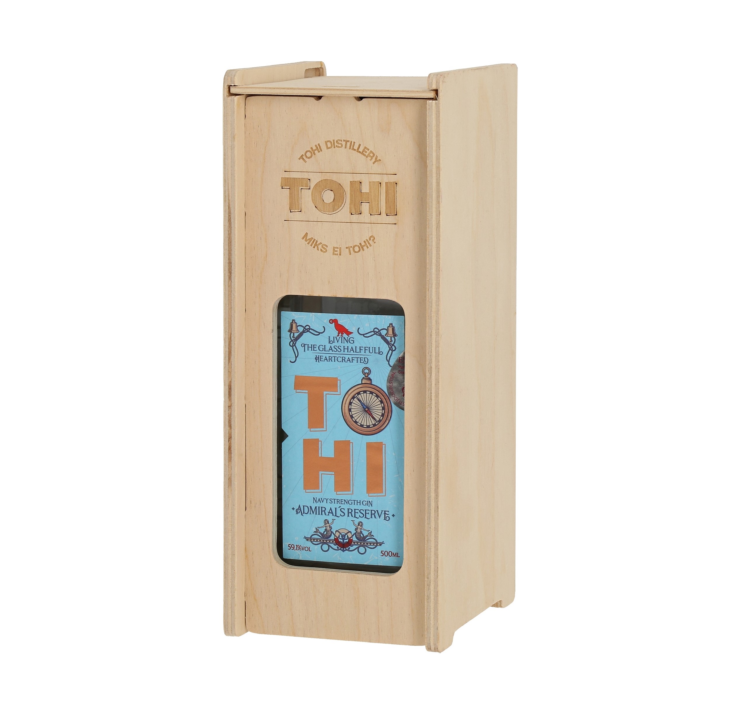 Ilus kingitus džinnisõbrale või siis soliidne firmakink. Puidust karbist leiad Tohi navy strength džinni, tuntud ka nn ajalooline meresõidu kanguses destilleeritud džinn. Sajandeid tagasi, testiti sadamates džinni kvaliteeti nii, et süüdati püssirohu ja džinni segu. Kui põles korralikult, tähendas, et džinn on hea kvaliteediga. Navy Strength tüüpi džinn peab alati olema vähemalt 57% vol kangusega. Tohi Amdiral´s Reserve Navy Strength džinn on koguni 59,1% vol – juhtumisi ka Tohi Distillery Kohila koordinaadid Eesti kaardil. Tohi Admiral´s Reserve on austusavaldus kõikidele tublidele meremeestele!